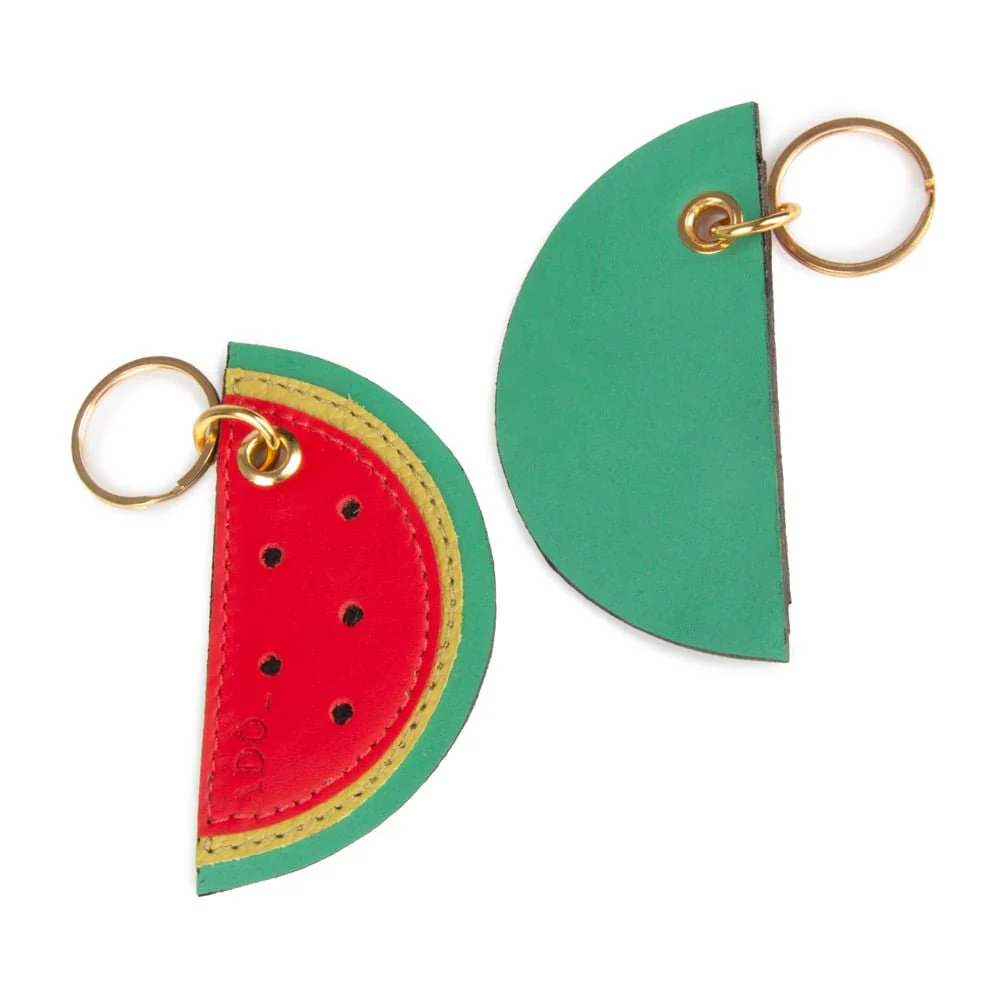Chaveiro utilitário confeccionado em couro com detalhe em argola para chaves e design divertido em forma de melancia.