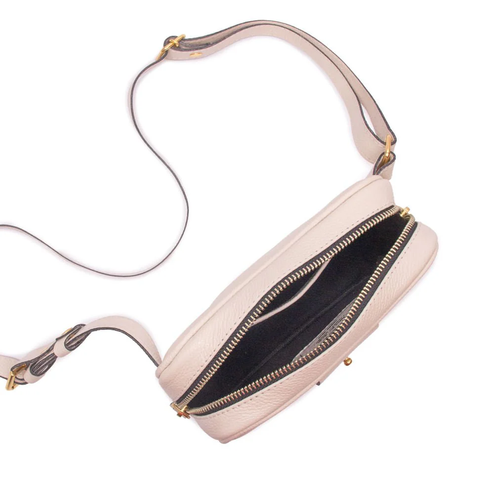 Material: Couro brasileiro na cor creme brulée com metais em banho dourado.
